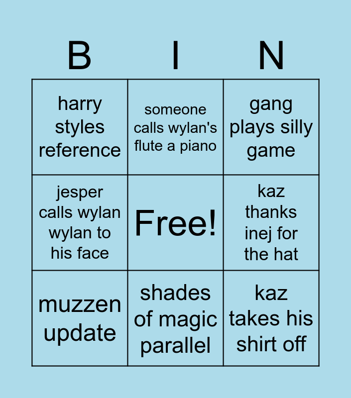 This bingo card has a free space and 8 words: kaz thanks inej for the hat, gang plays silly game, someone calls wylan's flute a piano, muzzen update, harry styles reference, kaz takes his shirt off, jesper calls wylan wylan to his face and shades of magic parallel.