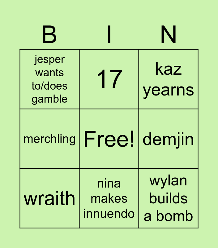 This bingo card has a free space and 8 words: demjin, kaz yearns, 17, wraith, jesper wants to/does gamble, wylan builds a bomb, merchling and nina makes innuendo.