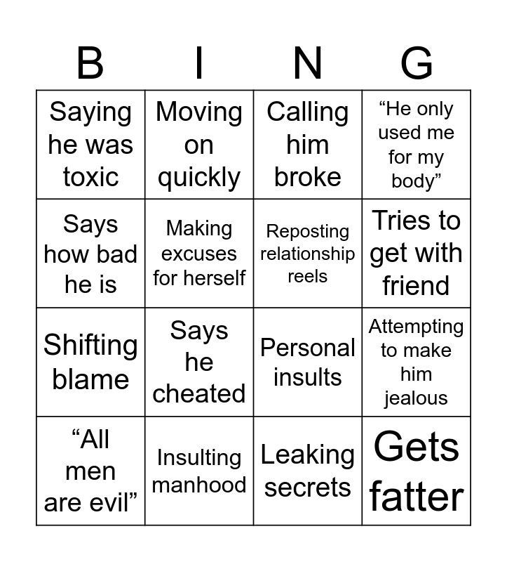 This bingo card has 16 words: Insulting manhood, Attempting to make him jealous, Calling him broke, Saying he was toxic, Shifting blame, Moving on quickly, Personal insults, Leaking secrets, Says how bad he is, Making excuses for herself, “All men are evil”, “He only used me for my body”, Says he cheated, Tries to get with friend, Reposting relationship reels and Gets fatter.