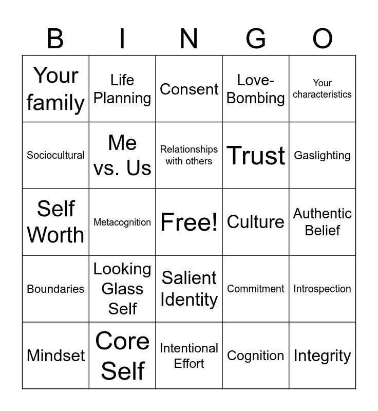 This bingo card has a free space and 26 words: Salient Identity, Cognition, Relationships with others, Core Self, Your characteristics, Your family, Sociocultural, Life Planning, Authentic Belief, Commitment, Trust, Self Worth, Introspection, Mindset, Metacognition, Non-Negotiable, Love-Bombing, Boundaries, Consent, Integrity, Gaslighting, Intentional Effort, Culture, Looking Glass Self, Me vs. Us and Sexuality.