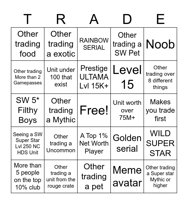 This bingo card has a free space and 24 words: Other trading a Uncommon, Other trading a unit from the rouge crate, Prestige ULTAMA Lvl 15K+, More than 5 people on the top 10% club, Noob, Other trading food, Other trading More than 2 Gamepasses, Other trading a exotic, Unit worth over 75M+, A Top 1% Net Worth Player, Level 15, SW 5* Filthy Boys, Golden serial, WILD SUPER STAR, Unit under 100 that exist, Meme avatar, Makes you trade first, RAINBOW SERIAL, Other trading over 8 different things, Other trading a Mythic, Other trading a Super star Mythic or higher, Seeing a SW Super Star Lvl 250 NC HDS Unit, Other trading a SW Pet and Other trading a pet.