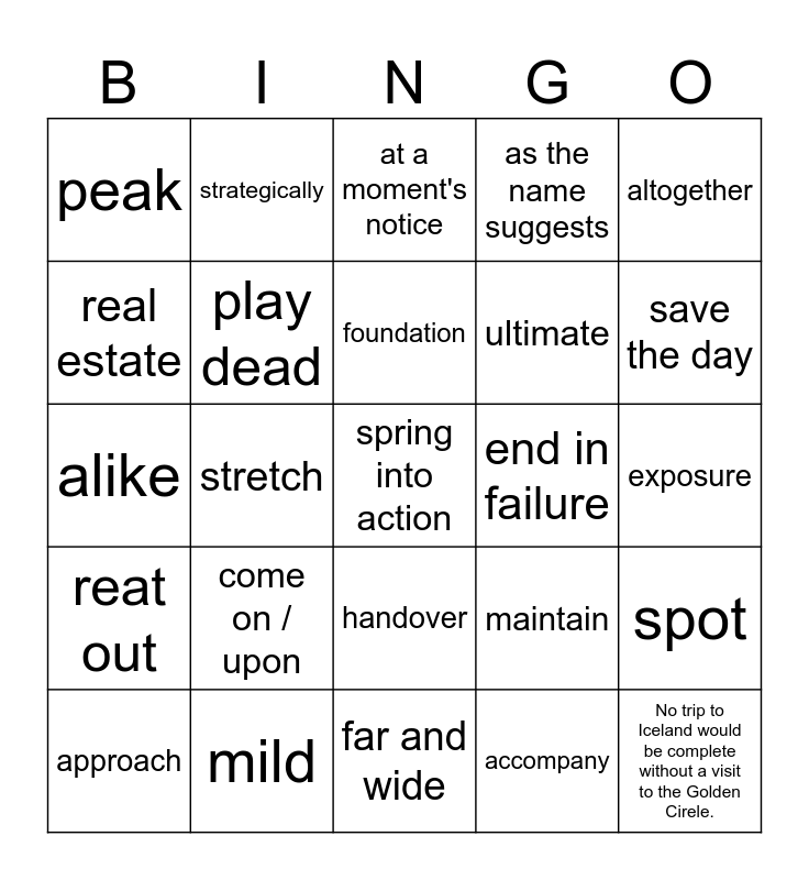 This bingo card has 26 words: handover, accompany, foundation, mild, altogether, peak, real estate, strategically, exposure, maintain, ultimate, alike, spot, approach, stretch, gve a real insight into, as the name suggests, reat out, at a moment's notice, spring into action, save the day, far and wide, end in failure, come on / upon, play dead and No trip to Iceland would be complete without a visit to the Golden Cirele..