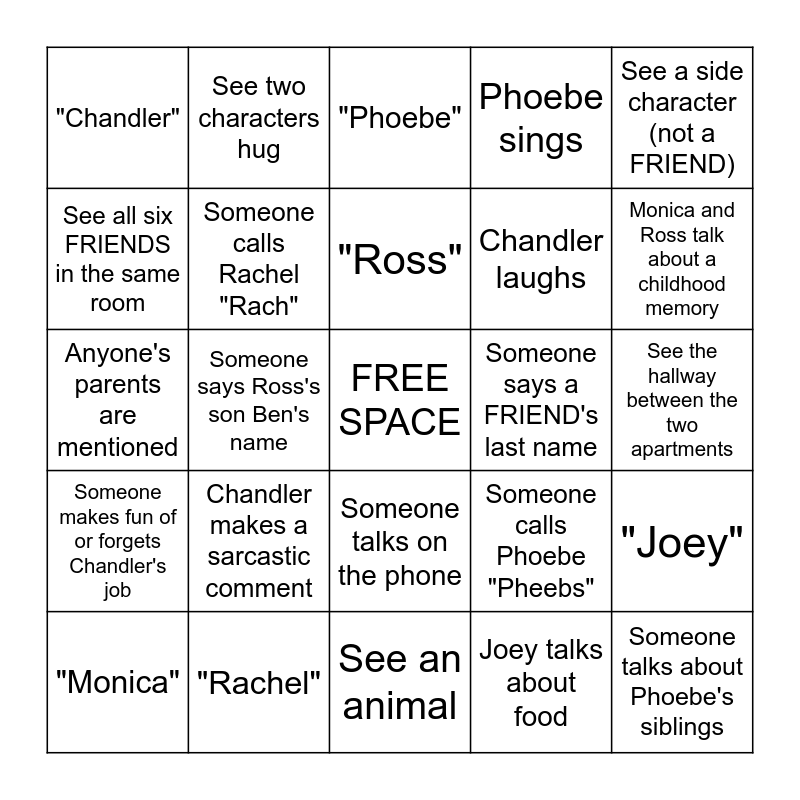 This bingo card has a free space and 24 words: Chandler makes a sarcastic comment, "Rachel", "Ross", "Monica", See a side character (not a FRIEND), "Chandler", See all six FRIENDS in the same room, See two characters hug, Someone says a FRIEND's last name, Someone talks on the phone, Chandler laughs, Anyone's parents are mentioned, Someone calls Phoebe "Pheebs", "Joey", Someone calls Rachel "Rach", Joey talks about food, See the hallway between the two apartments, "Phoebe", Monica and Ross talk about a childhood memory, Someone says Ross's son Ben's name, Someone talks about Phoebe's siblings, Someone makes fun of or forgets Chandler's job, Phoebe sings and See an animal.