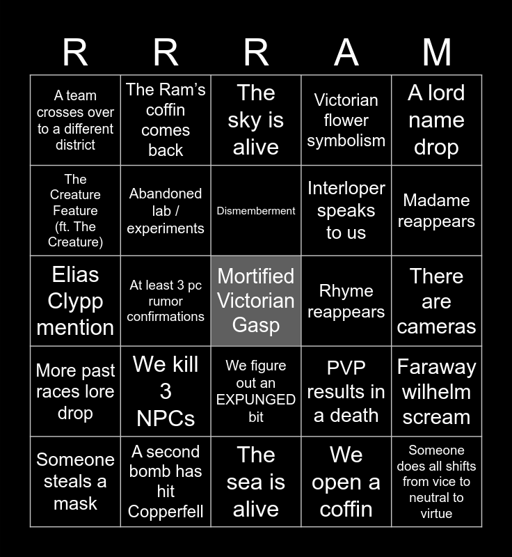 This bingo card has a free space and 24 words: We kill 3 NPCs, A second bomb has hit Copperfell, Dismemberment, Someone steals a mask, A lord name drop, A team crosses over to a different district, The Creature Feature (ft. The Creature), The Ram’s coffin comes back, Rhyme reappears, We figure out an EXPUNGED bit, Interloper speaks to us, Elias Clypp mention, PVP results in a death, Faraway wilhelm scream, Abandoned lab / experiments, We open a coffin, There are cameras, The sky is alive, Madame reappears, At least 3 pc rumor confirmations, Someone does all shifts from vice to neutral to virtue, More past races lore drop, Victorian flower symbolism and The sea is alive.