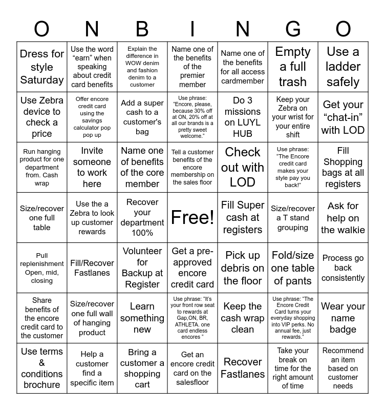 This bingo card has a free space and 50 words: Wear your name badge, Keep your Zebra on your wrist for your entire shift, Take your break on time for the right amount of time, Use the a Zebra to look up customer rewards, Name one of benefits of the core member, Get a pre-approved encore credit card, Use the word “earn” when speaking about credit card benefits, Get an encore credit card on the salesfloor, Empty a full trash, Pick up debris on the floor, Use a ladder safely, Name one of the benefits of the premier member, Use phrase: “The Encore credit card makes your style pay you back!”, Check out with LOD, Learn something new, Ask for help on the walkie, Use Zebra device to check a price, Get your “chat-in” with LOD, Use terms & conditions brochure, Name one of the benefits for all access cardmember, Do 3 missions on LUYL HUB, Recover your department 100%, Dress for style Saturday, Offer encore credit card using the savings calculator pop pop up, Help a customer find a specific item, Recommend an item based on customer needs, Add a super cash to a customer's bag, Bring a customer a shopping cart, Explain the difference in WOW denim and fashion denim to a customer, Tell a customer benefits of the encore membership on the sales floor, Look up a customer's reward account on the salesfloor, Pull replenishment Open, mid, closing, Size/recover one full wall of hanging product, Use phrase: “It’s your front row seat to rewards at Gap,ON, BR, ATHLETA. one card endless encores ”, Size/recover one full table, Size/recover a T stand grouping, Fold/size one table of pants, Process go back consistently, Share benefits of the encore credit card to the customer, Run hanging product for one department from. Cash wrap, Volunteer for Backup at Register, Keep the cash wrap clean, Fill/Recover Fastlanes, Recover Fastlanes, Fill Shopping bags at all registers, Use phrase: “Encore, please, because 30% off at ON, 20% off at all our brands is a pretty sweet welcome.”, Fill Super cash at registers, Use phrase: “The Encore Credit Card turns your everyday shopping into VIP perks. No annual fee, just rewards.”, Invite someone to work here and Protect a customer's personal information.