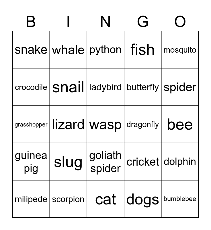 This bingo card has a free space and 29 words: milipede, centipede, lizard, elephant, snake, python, snail, slug, dragonfly, scorpion, bee, bumblebee, cat, dogs, spider, red lion fish, goliath spider, guinea pig, mosquito, grasshopper, cricket, fly, butterfly, crocodile, fish, whale, dolphin, ladybird and ant.