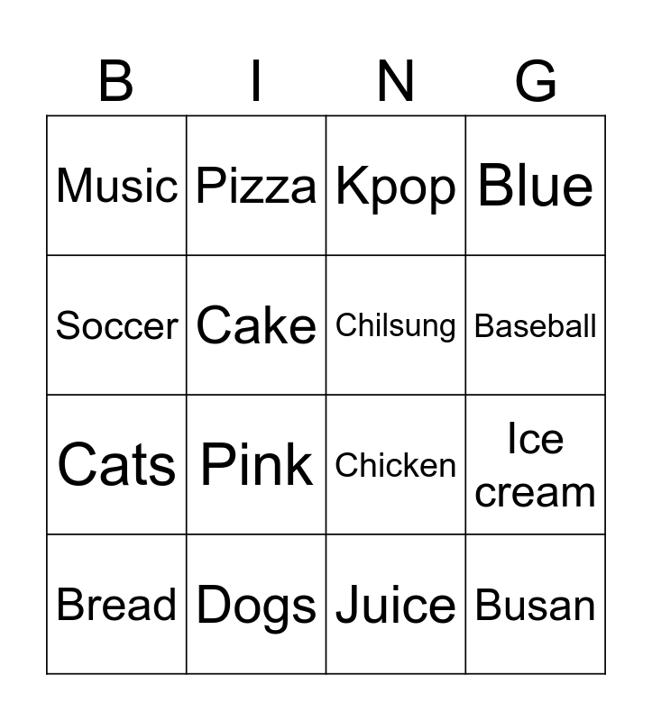 This bingo card has 16 words: Dogs, Ice cream, Kpop, Music, Cats, Pizza, Chicken, Juice, Soccer, Cake, Bread, Blue, Pink, Baseball, Chilsung and Busan.