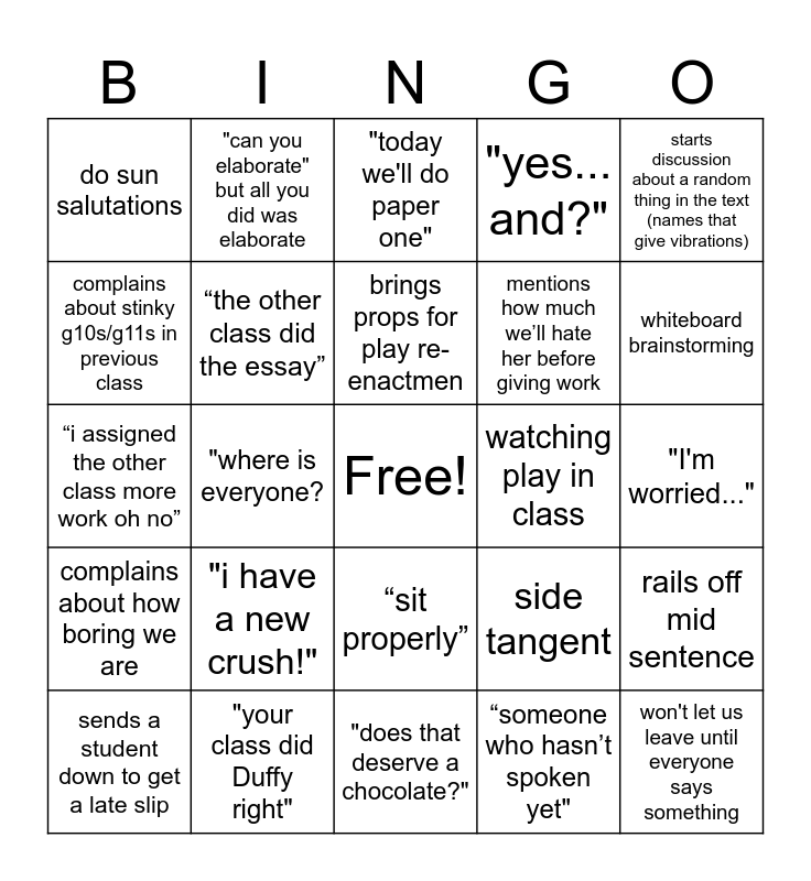 This bingo card has a free space and 24 words: "i have a new crush!", "your class did Duffy right", brings props for play re-enactmen, sends a student down to get a late slip, starts discussion about a random thing in the text (names that give vibrations), do sun salutations, complains about stinky g10s/g11s in previous class, "can you elaborate" but all you did was elaborate, watching play in class, “sit properly”, mentions how much we’ll hate her before giving work, “i assigned the other class more work oh no”, side tangent, rails off mid sentence, “the other class did the essay”, “someone who hasn’t spoken yet", "I'm worried...", "today we'll do paper one", whiteboard brainstorming, "where is everyone?, won't let us leave until everyone says something, complains about how boring we are, "yes... and?" and "does that deserve a chocolate?".