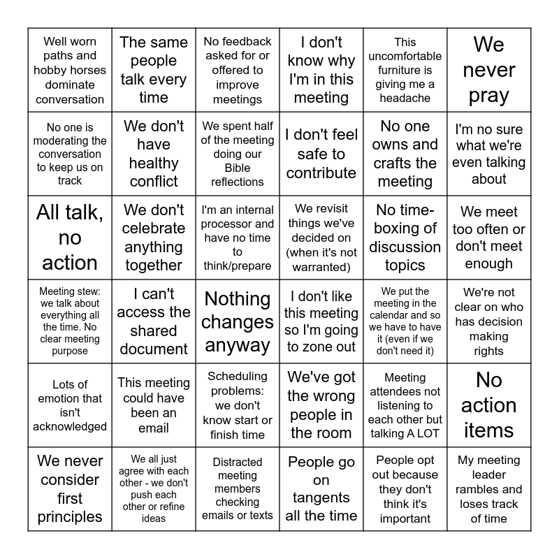 This bingo card has 36 words: We've got the wrong people in the room, Scheduling problems: we don't know start or finish time, People go on tangents all the time, No one is moderating the conversation to keep us on track, Meeting stew: we talk about everything all the time. No clear meeting purpose, We revisit things we've decided on (when it's not warranted), We don't have healthy conflict, Distracted meeting members checking emails or texts, This uncomfortable furniture is giving me a headache, Meeting attendees not listening to each other but talking A LOT, I'm no sure what we're even talking about, I don't know why I'm in this meeting, No action items, We don't celebrate anything together, I don't feel safe to contribute, Well worn paths and hobby horses dominate conversation, Lots of emotion that isn't acknowledged, No time-boxing of discussion topics, All talk, no action, No feedback asked for or offered to improve meetings, I'm an internal processor and have no time to think/prepare, I can't access the shared document, I don't like this meeting so I'm going to zone out, Nothing changes anyway, We put the meeting in the calendar and so we have to have it (even if we don't need it), The same people talk every time, No one owns and crafts the meeting, We all just agree with each other - we don't push each other or refine ideas, We spent half of the meeting doing our Bible reflections, We never pray, My meeting leader rambles and loses track of time, We never consider first principles, We're not clear on who has decision making rights, We meet too often or don't meet enough, This meeting could have been an email and People opt out because they don't think it's important.