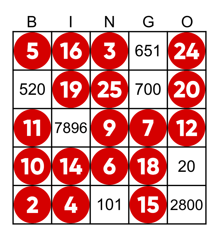 This bingo card has 24 images, a free space and 10 words: 101, 2800, 651, 1000, 700, 520, 8942, 7896, 20 and 1.