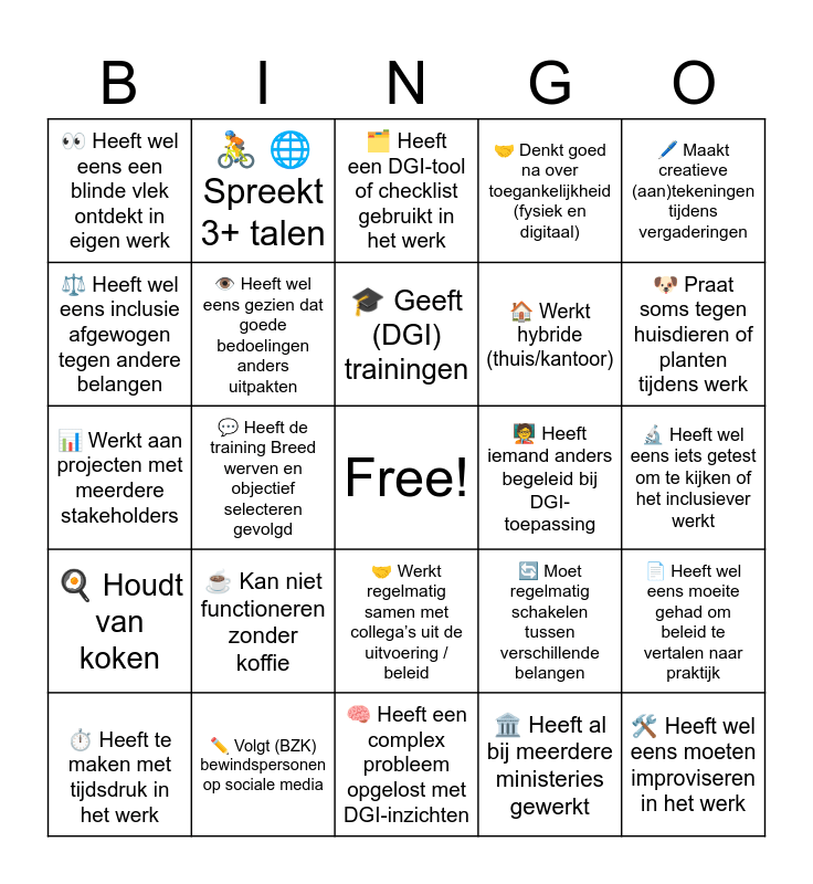 This bingo card has a free space and 24 words: β Kan niet functioneren zonder koffie, βοΈ Volgt (BZK) bewindspersonen op sociale media, π Geeft (DGI) trainingen, β±οΈ Heeft te maken met tijdsdruk in het werk, ποΈ Maakt creatieve (aan)tekeningen tijdens vergaderingen, π Heeft wel eens een blinde vlek ontdekt in eigen werk, βοΈ Heeft wel eens inclusie afgewogen tegen andere belangen, π΄ π Spreekt 3+ talen, π§βπ« Heeft iemand anders begeleid bij DGI-toepassing, π€ Werkt regelmatig samen met collegaβs uit de uitvoering / beleid, π Werkt hybride (thuis/kantoor), π Werkt aan projecten met meerdere stakeholders, π Moet regelmatig schakelen tussen verschillende belangen, π Heeft wel eens moeite gehad om beleid te vertalen naar praktijk, ποΈ Heeft wel eens gezien dat goede bedoelingen anders uitpakten, ποΈ Heeft al bij meerdere ministeries gewerkt, π¬ Heeft wel eens iets getest om te kijken of het inclusiever werkt, ποΈ Heeft een DGI-tool of checklist gebruikt in het werk, πΆ Praat soms tegen huisdieren of planten tijdens werk, π¬ Heeft de training Breed werven en objectief selecteren gevolgd, π οΈ Heeft wel eens moeten improviseren in het werk, π³ Houdt van koken, π€ Denkt goed na over toegankelijkheid (fysiek en digitaal) and π§ Heeft een complex probleem opgelost met DGI-inzichten.
