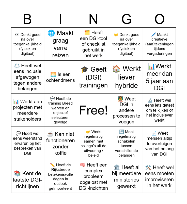 This bingo card has a free space and 24 words: โ Kan niet functioneren zonder koffie, โ๏ธ Heeft de Rijksbrede betekenisvolle dagen in outlook geรฏmporteerd, ๐ Geeft (DGI) trainingen, ๐ Kent de laatste DGI-richtlijnen, ๐๏ธ Maakt creatieve (aan)tekeningen tijdens vergaderingen, ๐ Denkt goed na over toegankelijkheid (fysiek en digitaal), โ๏ธ Heeft wel eens inclusie afgewogen tegen andere belangen, ๐ Maakt graag verre reizen, ๐งโ๐ซ Weet DGI in andere processen te voegen, ๐ค Werkt regelmatig samen met collegaโs uit de uitvoering / beleid, ๐ Werkt liever hybride, ๐ Werkt aan projecten met meerdere stakeholders, ๐ Moet regelmatig schakelen tussen verschillende belangen, ๐ Weet mensen altijd te overtuigen van het belang van DGI, ๐ Is een ochtendmens, ๐๏ธ Heeft al bij meerdere ministeries gewerkt, ๐ฌ Heeft wel eens iets getest om te kijken of het inclusiever werkt, ๐๏ธ Heeft een DGI-tool of checklist gebruikt in het werk, ๐Werkt meer dan 5 jaar aan DGI, ๐ฌ Heeft de training Breed werven en objectief selecteren gevolgd, ๐ ๏ธ Heeft wel eens moeten improviseren in het werk, ๐ฌ Heeft wel eens weerstand ervaren bij het bespreken van DGI, ๐ค Denkt goed na over toegankelijkheid (fysiek en digitaal) and ๐ง Heeft een complex probleem opgelost met DGI-inzichten.