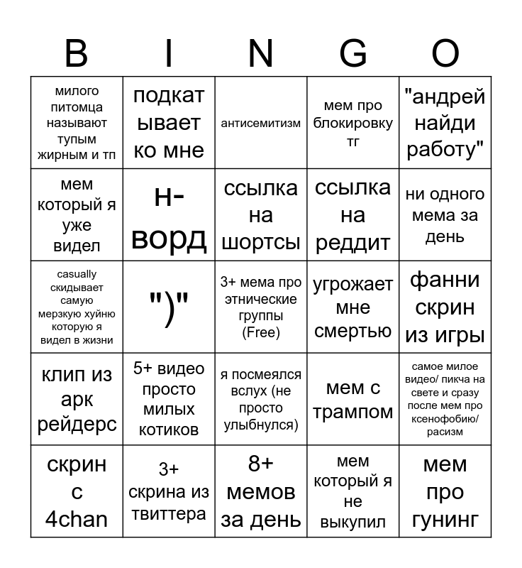 This bingo card has a free space and 24 words: 5+ видео просто милых котиков, 3+ скрина из твиттера, ссылка на шортсы, скрин с 4chan, "андрей найди работу", милого питомца называют тупым жирным и тп, мем который я уже видел, подкат ывает ко мне, угрожает мне смертью, я посмеялся вслух (не просто улыбнулся), ссылка на реддит, casually скидывает самую мерзкую хуйню которую я видел в жизни, мем с трампом, самое милое видео/ пикча на свете и сразу после мем про ксенофобию/расизм, н-ворд, мем который я не выкупил, фанни скрин из игры, антисемитизм, ни одного мема за день, ")", мем про гунинг, клип из арк рейдерс, мем про блокировку тг and 8+ мемов за день.