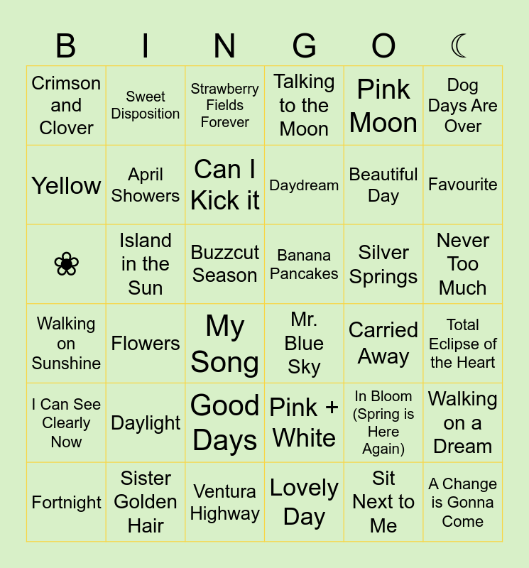 This bingo card has 36 words: Pink + White, Good Days, Lovely Day, Yellow, Walking on Sunshine, Banana Pancakes, April Showers, Ventura Highway, Pink Moon, In Bloom (Spring is Here Again), Favourite, Talking to the Moon, Walking on a Dream, Island in the Sun, Daydream, Crimson and Clover, I Can See Clearly Now, Silver Springs, ❀, Strawberry Fields Forever, Buzzcut Season, Flowers, Mr. Blue Sky, My Song, Carried Away, Sweet Disposition, Beautiful Day, Sister Golden Hair, Can I Kick it, Dog Days Are Over, A Change is Gonna Come, Fortnight, Total Eclipse of the Heart, Never Too Much, Daylight and Sit Next to Me.