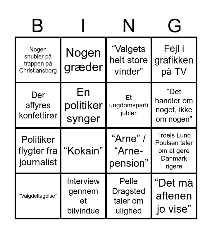 This bingo card has 60 words: “Vi skal kunne tælle til 90”, Inger Støjberg drikker Cola Zero, Lars Boje griner af noget han selv har sagt, “Det må aftenen jo vise”, Rødternede duge på bordene hos DF, “Nu er det her jo bare en exitpoll…”, Et ungdomsparti jubler, “Svinevalg”, Politiker flygter fra journalist, Der bliver taget et selfie, Fejl i grafikken på TV, Der drikkes fadøl, En politiker synger, Det bliver nævnt at Mette Frederiksen er fra Nordjylland, “Valgflæsk”, Nogen snubler på trappen på Christiansborg, “Valgdeltagelse”, Der affyres konfettirør, Rød politiker sidder i en ladcykel, “Det handler om noget, ikke om nogen”, Interview gennem et bilvindue, “Valgets helt store vinder”, “Jordskredsvalg”, “Vælgerlussing”, “TikTok” / “PoliTikTok”, To partiledere krammer, Tekniske udfordringer, Halvtom, død valgfest, “Kokain”, “Spærregrænsen”, “Højskolen”, “Jernmarker”, “Et nyt politisk landskab”, En partileder går af, Nogen græder, “Valggyser”, “Formueskat”, Troels Lund Poulsen taler om at gøre Danmark rigere, “Kongelig undersøger”, “Arne” / “Arne-pension”, Franciska Rosenkilde taler om klima, Morten Messerschmidt taler om udlændinge, Pelle Dragsted taler om ulighed, Mona Juul taler om skattelettelser, Der bliver stillet om til en reporter i Sønderjylland, Der bliver stillet om til en reporter i Vestjylland, Der bliver stillet om til en reporter i Midtjylland, Der bliver stillet om til en reporter i Nordjylland, Der bliver stillet om til en reporter på Fyn, Der bliver stillet om til en reporter på Bornholm, Lars Løkke virker irriteret over et spørgsmål, TV-billeder fra Grønland, Interview med en førstegangsvælger, “Sprøjteforbud”, “Ultimativt krav”, Man ser en partileder putte sin stemme i stemmeboksen, En partileder takker sine frivillige, “Store bededag”, En beholder med stemmesedler bliver tømt and Der spekuleres om om en partileder kommer til at gå af.
