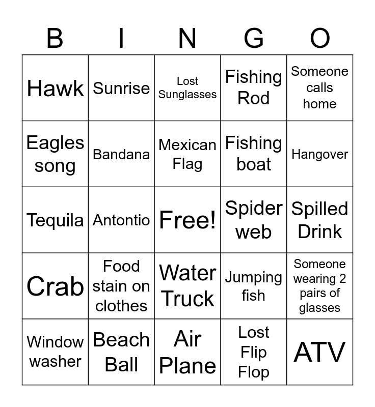 This bingo card has a free space and 24 words: Food stain on clothes, Beach Ball, Mexican Flag, Window washer, Someone calls home, Hawk, Eagles song, Sunrise, Spider web, Water Truck, Fishing boat, Tequila, Jumping fish, Someone wearing 2 pairs of glasses, Bandana, Lost Flip Flop, Spilled Drink, Lost Sunglasses, Hangover, Antontio, ATV, Crab, Fishing Rod and Air Plane.