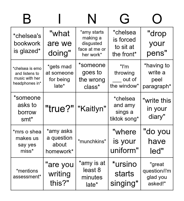 This bingo card has a free space and 24 words: *amy asks a question about homework*, "are you writing this?", *someone goes to the wrong class*, *mentions assessment*, "drop your pens", *chelsea's bookwork is glazed*, *chelsea is emo and listens to music with her headphones in*, "what are we doing", *chelsea and amy sings a tiktok song*, "munchkins", "I'm throwing ___ out of the window", *someone asks to borrow smt*, "where is your uniform", "do you have led", *gets mad at someone for being late*, *ursino starts singing*, "write this in your diary", *amy starts making a disgusted face at me or her work*, *having to write a peel paragraph*, "true?", "great question/i'm glad you asked!", *mrs o shea makes us say yes miss*, *chelsea is forced to sit at the front* and *amy is at least 8 minutes late*.