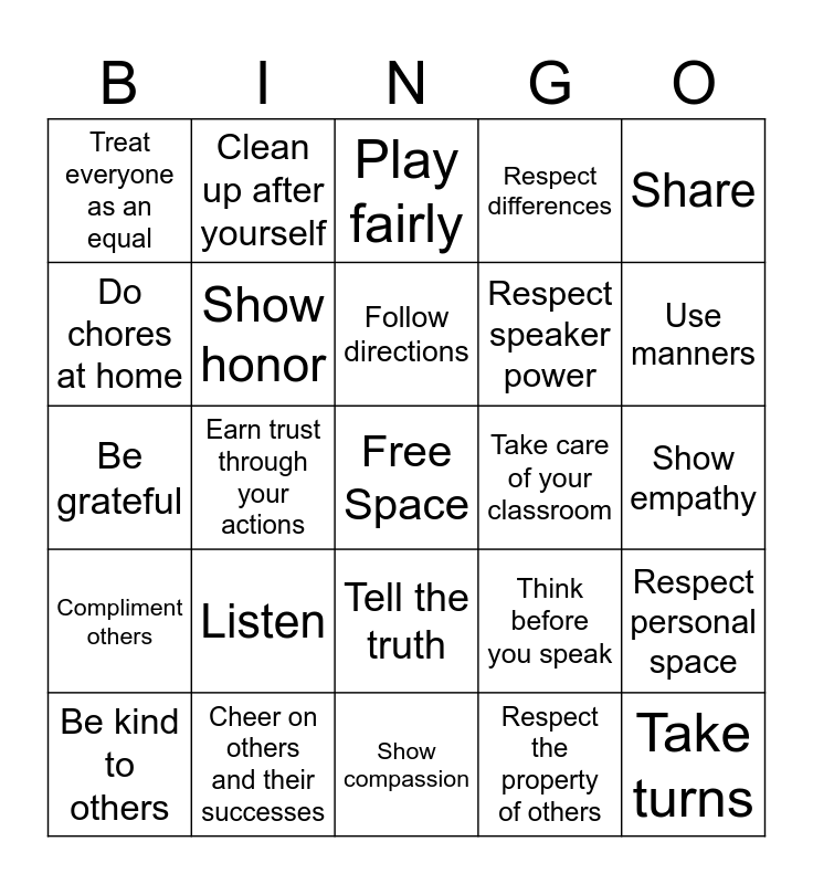This bingo card has a free space and 24 words: Listen, Cheer on others and their successes, Follow directions, Be kind to others, Share, Treat everyone as an equal, Do chores at home, Clean up after yourself, Take care of your classroom, Tell the truth, Respect speaker power, Be grateful, Think before you speak, Respect personal space, Show honor, Respect the property of others, Show empathy, Play fairly, Use manners, Earn trust through your actions, Take turns, Compliment others, Respect differences and Show compassion.