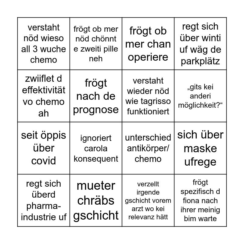This bingo card has 16 words: mueter chräbs gschicht, sich über maske ufrege, frögt ob mer chan operiere, verstaht nöd wieso all 3 wuche chemo, seit öppis über covid, frögt ob mer nöd chönnt e zweiti pille neh, unterschied antikörper/ chemo, verzellt irgende gschicht vorem arzt wo kei relevanz hätt, zwiiflet d effektivität vo chemo ah, frögt nach de prognose, regt sich überd pharma-industrie uf, regt sich über winti uf wäg de parkplätz, ignoriert carola konsequent, „gits kei anderi möglichkeit?“, verstaht wieder nöd wie tagrisso funktioniert and frögt spezifisch d fiona nach ihrer meinig bim warte.