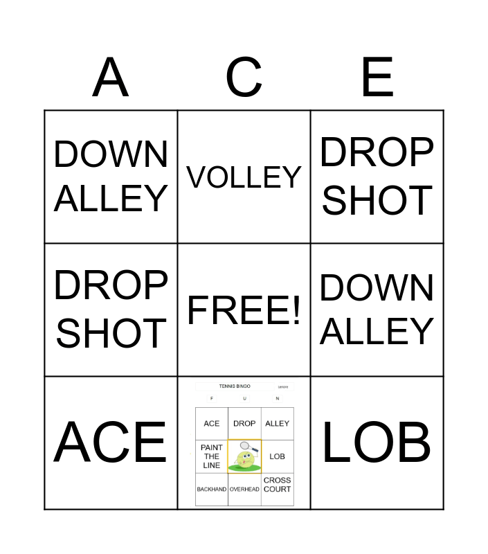 This bingo card has 1 images, a free space and 8 words: ACE, DROP SHOT, VOLLEY, DROP SHOT, DOWN ALLEY, DOWN ALLEY, LOB and ACE.