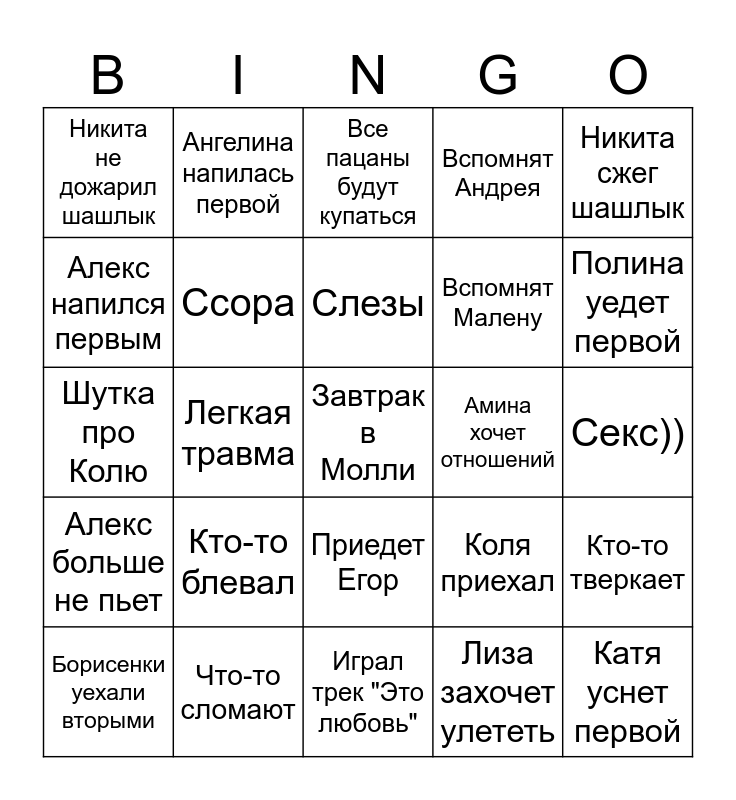 This bingo card has 25 words: Кто-то блевал, Играл трек "Это любовь", Слезы, Борисенки уехали вторыми, Никита сжег шашлык, Никита не дожарил шашлык, Алекс напился первым, Ангелина напилась первой, Амина хочет отношений, Приедет Егор, Вспомнят Малену, Шутка про Колю, Коля приехал, Кто-то тверкает, Ссора, Катя уснет первой, Секс)), Все пацаны будут купаться, Полина уедет первой, Легкая травма, Завтрак в Молли, Что-то сломают, Алекс больше не пьет, Вспомнят Андрея and Лиза захочет улететь.