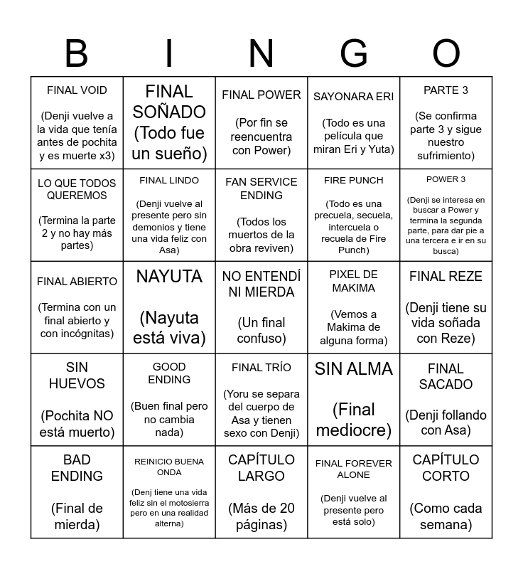 This bingo card has a free space and 24 words: GOOD ENDING (Buen final pero no cambia nada), REINICIO BUENA ONDA (Denj tiene una vida feliz sin el motosierra pero en una realidad alterna), FAN SERVICE ENDING (Todos los muertos de la obra reviven), BAD ENDING (Final de mierda), PARTE 3 (Se confirma parte 3 y sigue nuestro sufrimiento), FINAL VOID (Denji vuelve a la vida que tenía antes de pochita y es muerte x3), LO QUE TODOS QUEREMOS (Termina la parte 2 y no hay más partes), FINAL SOÑADO (Todo fue un sueño), PIXEL DE MAKIMA (Vemos a Makima de alguna forma), FINAL TRÍO (Yoru se separa del cuerpo de Asa y tienen sexo con Denji), FIRE PUNCH (Todo es una precuela, secuela, intercuela o recuela de Fire Punch), FINAL ABIERTO (Termina con un final abierto y con incógnitas), SIN ALMA (Final mediocre), FINAL SACADO (Denji follando con Asa), FINAL LINDO (Denji vuelve al presente pero sin demonios y tiene una vida feliz con Asa), FINAL FOREVER ALONE (Denji vuelve al presente pero está solo), FINAL REZE (Denji tiene su vida soñada con Reze), FINAL POWER (Por fin se reencuentra con Power), POWER 3 (Denji se interesa en buscar a Power y termina la segunda parte, para dar pie a una tercera e ir en su busca), NAYUTA (Nayuta está viva), CAPÍTULO CORTO (Como cada semana), SIN HUEVOS (Pochita NO está muerto), SAYONARA ERI (Todo es una película que miran Eri y Yuta) and CAPÍTULO LARGO (Más de 20 páginas).
