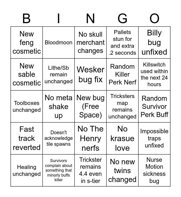 This bingo card has a free space and 24 words: Doesn't acknowledge tile spawns, Survivors complain about something that minorly buffs killer, Wesker bug fix, Healing unchanged, Billy bug unfixed, New feng cosmetic, New sable cosmetic, Bloodmoon, Tricksters map remains unchanged, No The Henry nerfs, Random Killer Perk Nerf, Toolboxes unchanged, No krasue love, Impossible traps unfixed, Lithe/Sb remain unchanged, No new twins changed, Random Survivor Perk Buff, No skull merchant changes, Killswitch used within the next 24 hours, No meta shake up, Nurse Motion sickness bug, Fast track reverted, Pallets stun for and extra .2 seconds and Trickster remains 4.4 even in s-tier.