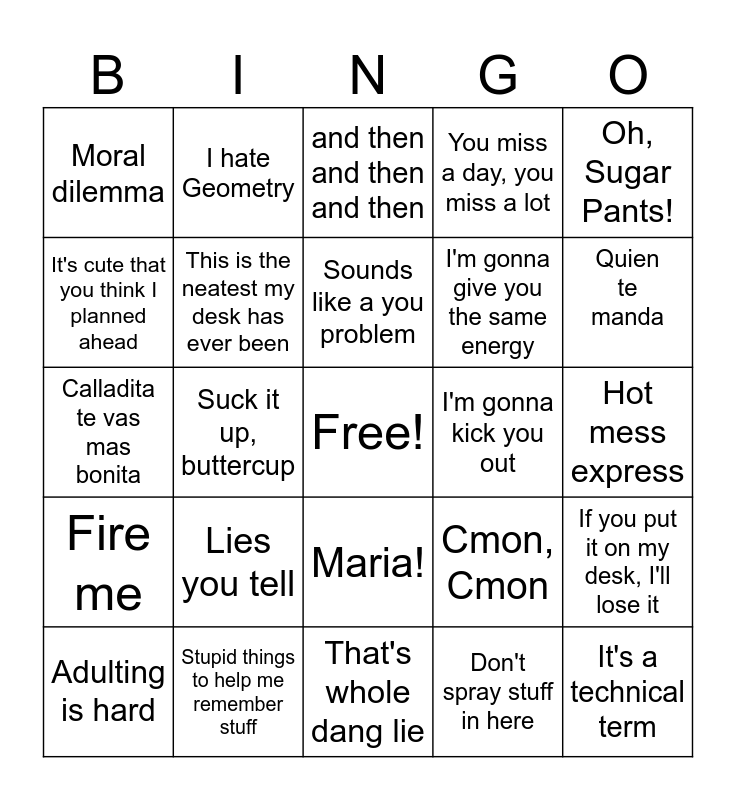 This bingo card has a free space and 24 words: Lies you tell, Stupid things to help me remember stuff, Sounds like a you problem, Adulting is hard, Oh, Sugar Pants!, Moral dilemma, It's cute that you think I planned ahead, I hate Geometry, I'm gonna kick you out, Maria!, I'm gonna give you the same energy, Calladita te vas mas bonita, Cmon, Cmon, If you put it on my desk, I'll lose it, This is the neatest my desk has ever been, Don't spray stuff in here, Hot mess express, and then and then and then, Quien te manda, Suck it up, buttercup, It's a technical term, Fire me, You miss a day, you miss a lot and That's whole dang lie.