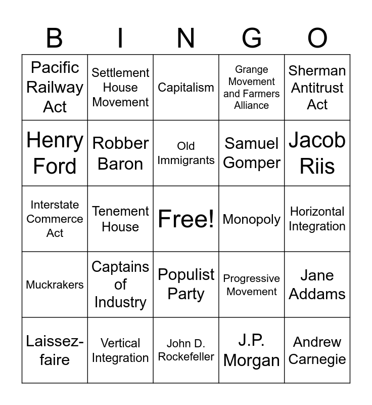 This bingo card has a free space and 29 words: Laissez-faire, Urbanization, Tenement House, Industrialization, Pacific Railway Act, Capitalism, Robber Baron, Captains of Industry, Monopoly, Vertical Integration, Horizontal Integration, Andrew Carnegie, John D. Rockefeller, J.P. Morgan, Jacob Riis, Upton Sinclair, Populist Party, Muckrakers, Sherman Antitrust Act, Interstate Commerce Act, Progressive Movement, Meat Inspection Act, Samuel Gomper, Henry Ford, Grange Movement and Farmers Alliance, Settlement House Movement, Jane Addams, Old Immigrants and New Immigrants.