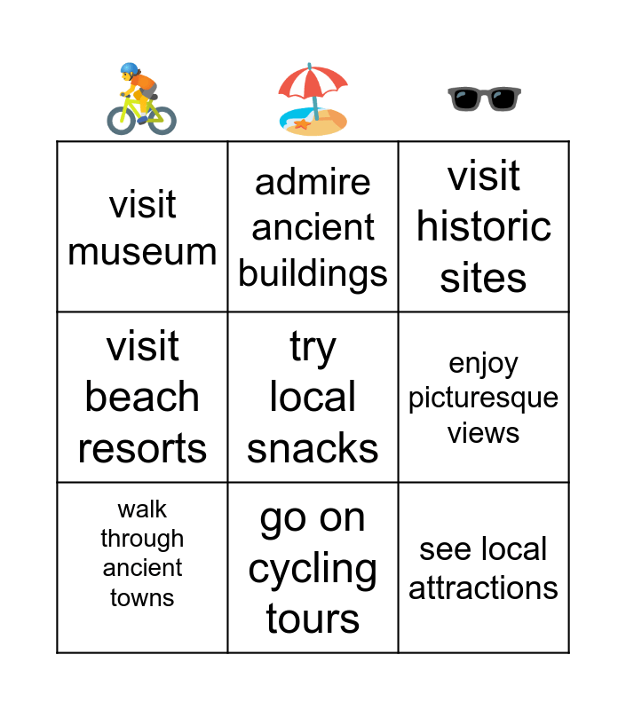 This bingo card has 5 images, a free space and 8 words: enjoy picturesque views, visit historic sites, admire ancient buildings, walk through ancient towns, visit museum, see local attractions, visit beach resorts and go on cycling tours.