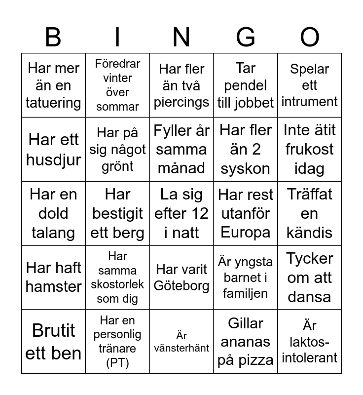 This bingo card has 25 words: Har samma skostorlek som dig, Är vänsterhänt, Fyller år samma månad, Brutit ett ben, Spelar ett intrument, Har mer än en tatuering, Har ett husdjur, Föredrar vinter över sommar, Har rest utanför Europa, Har varit Göteborg, Har fler än 2 syskon, Har en dold talang, Är yngsta barnet i familjen, Tycker om att dansa, Har på sig något grönt, Är laktos-intolerant, Träffat en kändis, Har fler än två piercings, Inte ätit frukost idag, Har bestigit ett berg, La sig efter 12 i natt, Har en personlig tränare (PT), Har haft hamster, Tar pendel till jobbet and Gillar ananas på pizza.