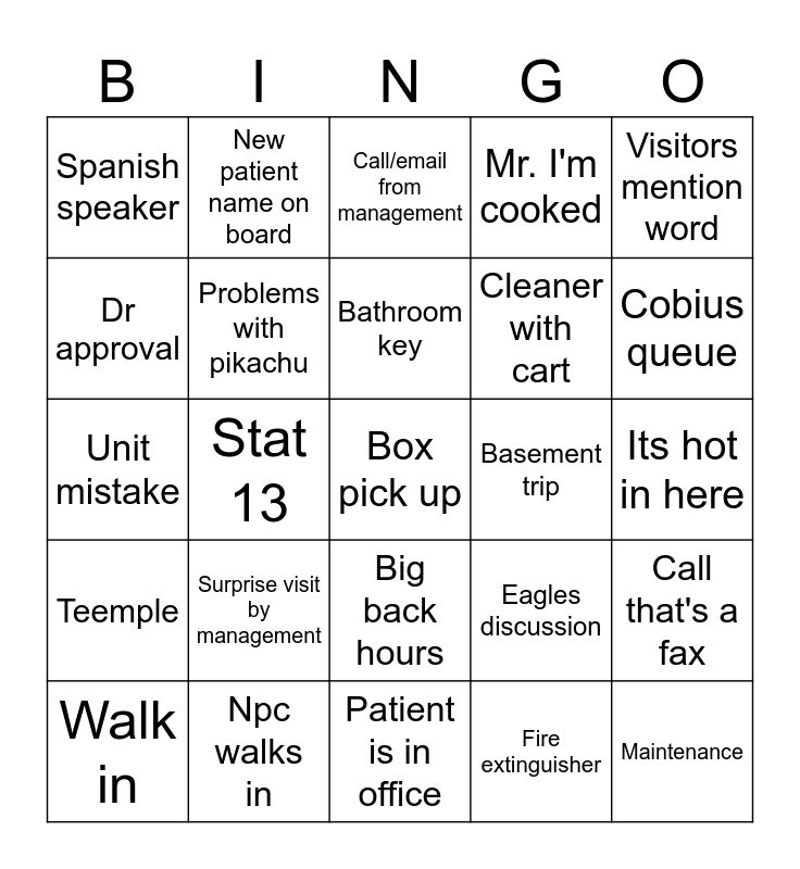 This bingo card has a free space and 24 words: Surprise visit by management, Npc walks in, Bathroom key, Walk in, Visitors mention word, Spanish speaker, Dr approval, New patient name on board, Basement trip, Big back hours, Cleaner with cart, Unit mistake, Eagles discussion, Call that's a fax, Problems with pikachu, Fire extinguisher, Its hot in here, Call/email from management, Cobius queue, Stat 13, Maintenance, Teemple, Mr. I'm cooked and Patient is in office.