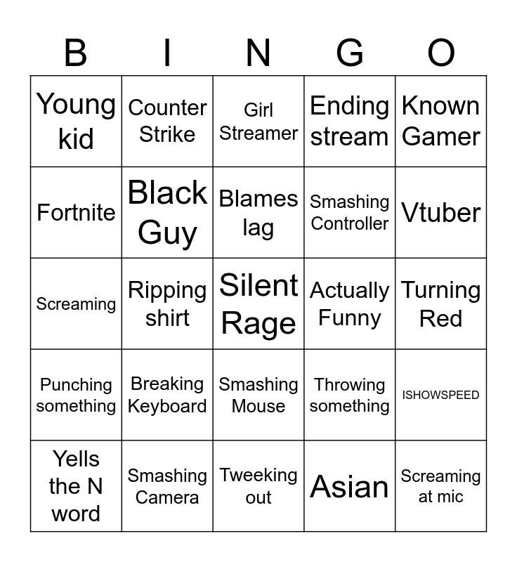 This bingo card has a free space and 24 words: Breaking Keyboard, Smashing Camera, Blames lag, Yells the N word, Known Gamer, Young kid, Fortnite, Counter Strike, Actually Funny, Smashing Mouse, Smashing Controller, Screaming, Throwing something, ISHOWSPEED, Black Guy, Asian, Turning Red, Girl Streamer, Vtuber, Ripping shirt, Screaming at mic, Punching something, Ending stream and Tweeking out.