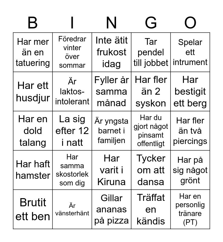 This bingo card has a free space and 24 words: Har samma skostorlek som dig, Är vänsterhänt, Fyller år samma månad, Brutit ett ben, Spelar ett intrument, Har mer än en tatuering, Har ett husdjur, Föredrar vinter över sommar, Har du gjort något pinsamt offentligt, Har varit i Kiruna, Har fler än 2 syskon, Har en dold talang, Tycker om att dansa, Har på sig något grönt, Är laktos-intolerant, Träffat en kändis, Har fler än två piercings, Inte ätit frukost idag, Har bestigit ett berg, La sig efter 12 i natt, Har en personlig tränare (PT), Har haft hamster, Tar pendel till jobbet and Gillar ananas på pizza.
