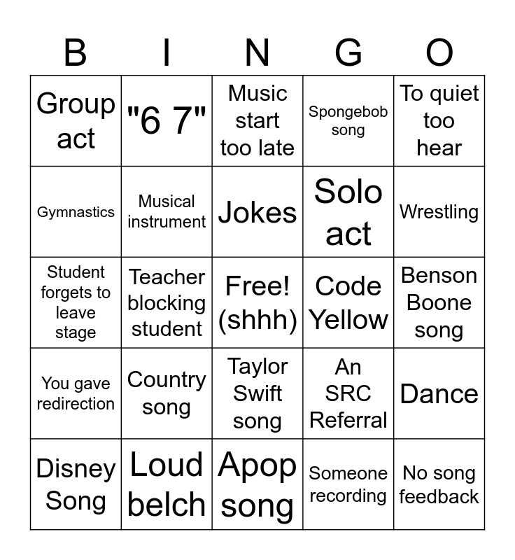 This bingo card has a free space and 46 words: A Code Brown, No song feedback, Jump rope, Apop song, Country song, Teacher sneaks off, "6 7", Someone Cries, Gymnastics, Teacher wheels chair, Musical instrument, Spongebob song, Dance, An SRC Referral, Crowd clapping along, Speaker feedback, Jokes, Code Yellow, Late class, To quiet too hear, Teacher blocking student, Someone recording, Group act, Solo act, Karate, Wrestling, Disney Song, Song from the 1900's, Taylor Swift song, You gave redirection, Someone trips, Fight broke out, K-pop demon hunters, Student needing a redo, Loud fart, Loud belch, Benson Boone song, Katy Perry song, Chappell Roan song, Alex Warren song, Music starts too early, Music start too late, Student forgets to leave stage, Eloper elopes, A prop falls over and audience "oohs & ahhhs".