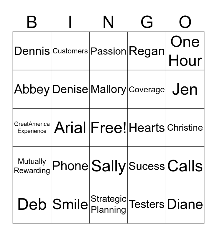This bingo card has a free space and 24 words: Phone, Smile, Mallory, Deb, One Hour, Dennis, Abbey, Customers, Hearts, Sally, Coverage, GreatAmerica Experience, Sucess, Calls, Denise, Testers, Christine, Passion, Jen, Arial, Diane, Mutually Rewarding, Regan and Strategic Planning.
