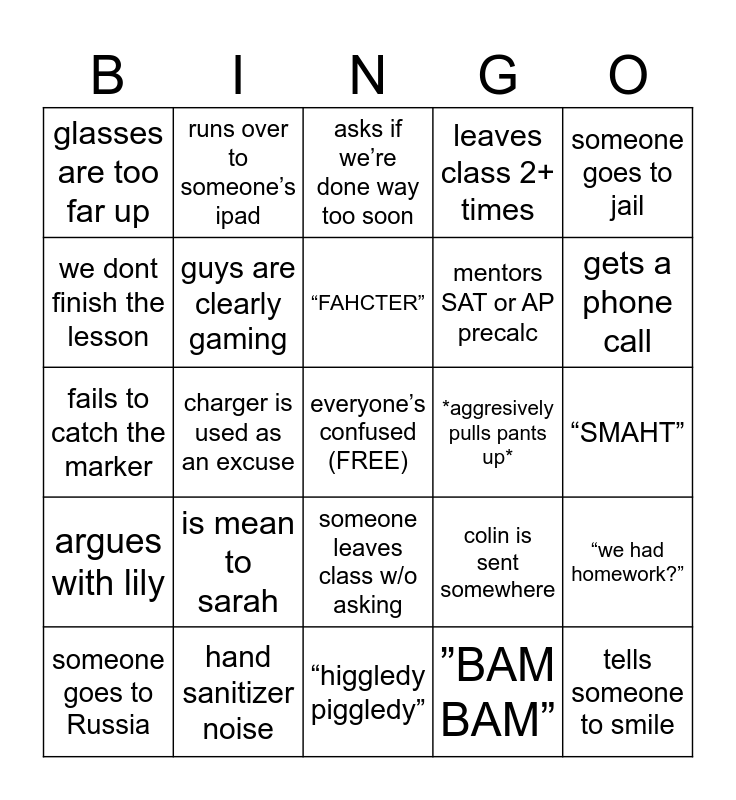 This bingo card has a free space and 34 words: “Mikeyboo”, ”BAM BAM”, ”plug it in”, *laughs creepily*, argues with lily, guys are clearly gaming, someone goes to jail, someone goes to Russia, runs over to someone’s ipad, “adrias”, “FAHCTER”, asks if we’re done way too soon, argues with dennis, wearing a military hat, *aggresively pulls pants up*, gets a phone call, hand sanitizer noise, fails to catch the marker, is mean to sarah, colin is sent somewhere, someone leaves class w/o asking, mentions his doctor/medicine, glasses are too far up, “SMAHT”, “higgledy piggledy”, tells someone to smile, leaves class 2+ times, technical difficulties, mentors SAT or AP precalc, we dont finish the lesson, starts notes with too much writing, charger is used as an excuse, “we had homework?” and sub yesterday, today, or tmrw.