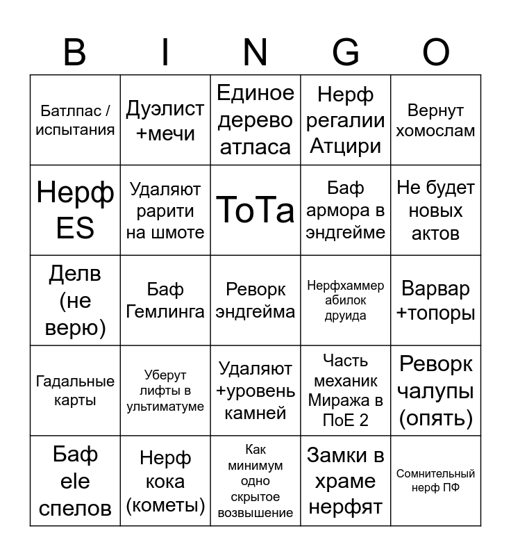 This bingo card has a free space and 24 words: Уберут лифты в ультиматуме, Нерф кока (кометы), ТоТа, Баф ele спелов, Вернут хомослам, Батлпас / испытания, Нерф ES, Дуэлист +мечи, Нерфхаммер абилок друида, Удаляют +уровень камней, Баф армора в эндгейме, Делв (не верю), Часть механик Миража в ПоЕ 2, Реворк чалупы (опять), Удаляют рарити на шмоте, Замки в храме нерфят, Варвар +топоры, Единое дерево атласа, Не будет новых актов, Баф Гемлинга, Сомнительный нерф ПФ, Гадальные карты, Нерф регалии Атцири and Как минимум одно скрытое возвышение.