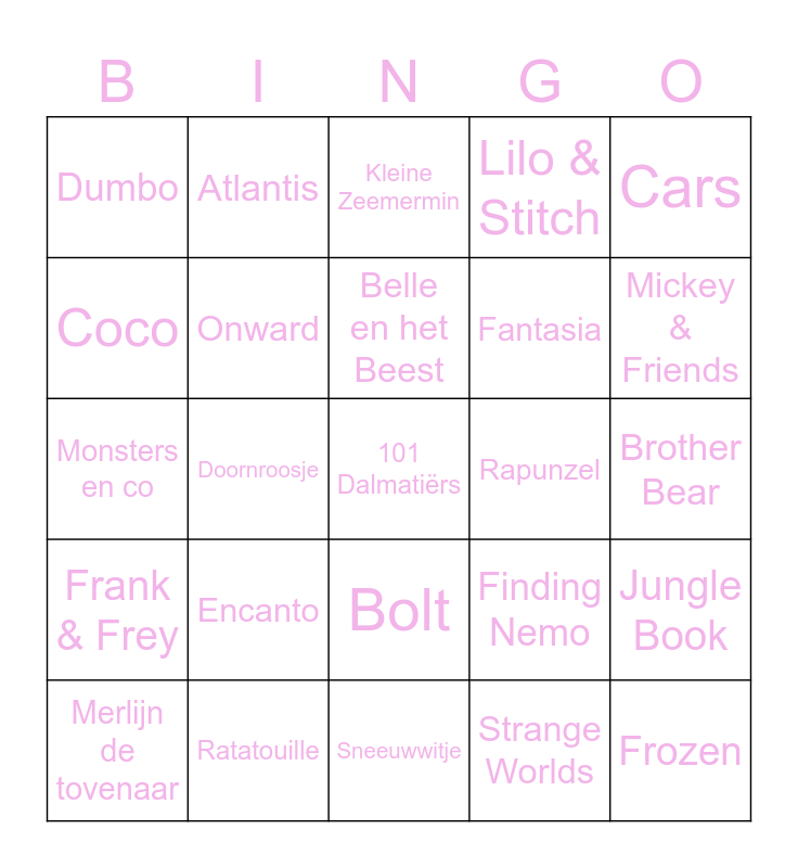 This bingo card has 68 words: Eigen keuze, 101 Dalmatiërs, Aladdin, Alice in wonderland, Aristokatten, Assepoester, Atlantis, Bambi, Belle en het Beest, Big hero 6, Bolt, Brave, Brother Bear, Cars, Chicken Little, Coco, Doornroosje, Dumbo, Elemental, Encanto, Fantasia, Finding Nemo, Frank & Frey, Frozen, Good Dinosaur, Hercules, Incredibles, Inside Out, Jungle Book, Keizer Kuzco, Kleine Zeemermin, Klokkenluider vd Notre Dame, Lady en de Vagebond, Leeuwenkoning, Lilo & Stitch, Luca, Luizenleven, Merlijn de tovenaar, Mickey & Friends, Monsters en co, Mulan, Oliver en Co, Onward, Peter Pan, Pinokkio, Piratenplaneet, Pocahontas, Prinses en de Kikker, Rapunzel, Ratatouille, Raya en de laatste draak, Reddertjes, Robin Hood, Sneeuwwitje, Soul, Speurneuzen, Strange Worlds, Taran en de Toverketel, Tinkerbel, Disney Fairies, Toy Story, Turning red, Up, Vaiana, Wall-E, Winnie de Pooh, Wish, Wreck-it Ralph and Zootopia.