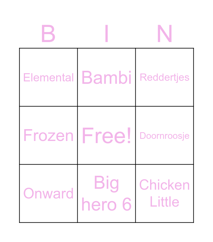 This bingo card has a free space and 67 words: 101 Dalmatiërs, Aladdin, Alice in wonderland, Aristokatten, Assepoester, Atlantis, Bambi, Belle en het Beest, Big hero 6, Bolt, Brave, Brother Bear, Cars, Chicken Little, Coco, Doornroosje, Dumbo, Elemental, Encanto, Fantasia, Finding Nemo, Frank & Frey, Frozen, Good Dinosaur, Hercules, Incredibles, Inside Out, Jungle Book, Keizer Kuzco, Kleine Zeemermin, Klokkenluider vd Notre Dame, Lady en de Vagebond, Leeuwenkoning, Lilo & Stitch, Luca, Luizenleven, Merlijn de tovenaar, Mickey & Friends, Monsters en co, Mulan, Oliver en Co, Onward, Peter Pan, Pinokkio, Piratenplaneet, Pocahontas, Prinses en de Kikker, Rapunzel, Ratatouille, Raya en de laatste draak, Reddertjes, Robin Hood, Sneeuwwitje, Soul, Speurneuzen, Strange Worlds, Taran en de Toverketel, Tinkerbel, Disney Fairies, Toy Story, Turning red, Up, Vaiana, Wall-E, Winnie de Pooh, Wish, Wreck-it Ralph and Zootopia.