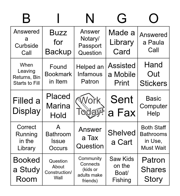 This bingo card has a free space and 24 words: A Bathroom Issue Occurs, Question About Construction/ Wall, Helped an Infamous Patron, Booked a Study Room, Answered a Paula Call, Answered a Curbside Call, When Leaving Returns, Bin Starts to Fill, Buzz for Backup, Sent a Fax, Answer a Tax Question, Assisted a Mobile Print, Filled a Display, Shelved a Cart, Both Staff Bathrooms in Use, Must Wait, Found Bookmark in Item, Saw Kids on the Boat/ Fishing, Basic Computer Help, Answer Notary/ Passport Question, Hand Out Stickers, Placed Marina Hold, Patron Shares Story, Correct Running in the Library, Made a Library Card and Community Connects (kids or adults make friends).