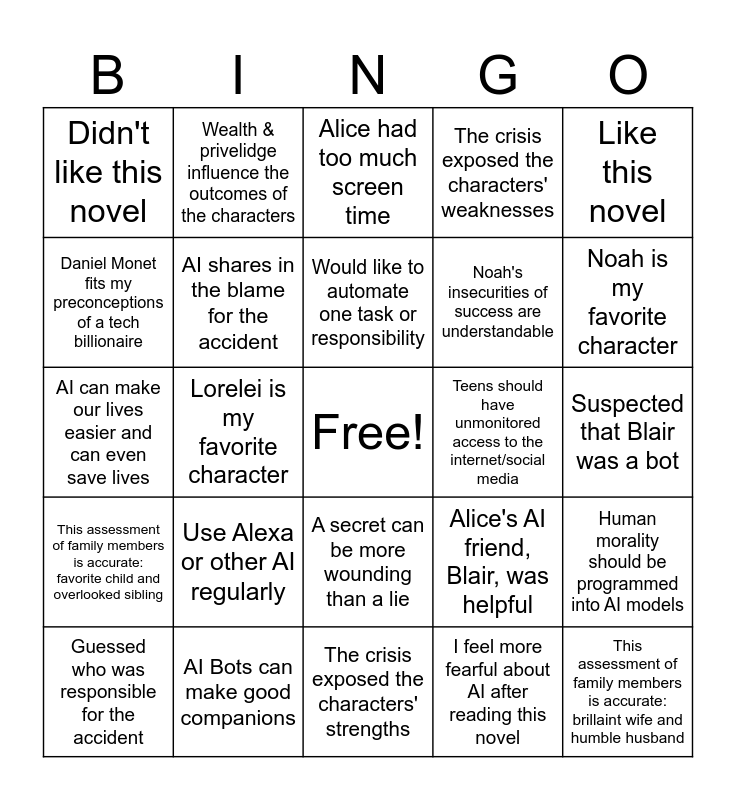 This bingo card has a free space and 24 words: Use Alexa or other AI regularly, AI Bots can make good companions, Would like to automate one task or responsibility, Guessed who was responsible for the accident, Like this novel, Didn't like this novel, Daniel Monet fits my preconceptions of a tech billionaire, Wealth & privelidge influence the outcomes of the characters, Teens should have unmonitored access to the internet/social media, A secret can be more wounding than a lie, Noah's insecurities of success are understandable, AI can make our lives easier and can even save lives, Alice's AI friend, Blair, was helpful, Human morality should be programmed into AI models, AI shares in the blame for the accident, I feel more fearful about AI after reading this novel, Suspected that Blair was a bot, Alice had too much screen time, Noah is my favorite character, Lorelei is my favorite character, This assessment of family members is accurate: brillaint wife and humble husband, This assessment of family members is accurate: favorite child and overlooked sibling, The crisis exposed the characters' weaknesses and The crisis exposed the characters' strengths.