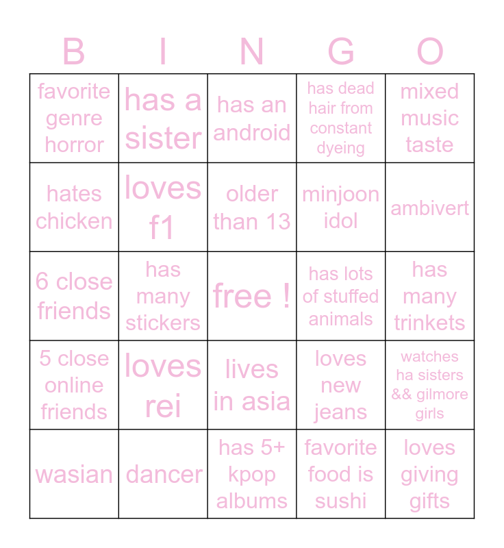 This bingo card has a free space and 24 words: loves rei, dancer, older than 13, wasian, mixed music taste, favorite genre horror, hates chicken, has a sister, has lots of stuffed animals, lives in asia, minjoon idol, 6 close friends, loves new jeans, watches ha sisters && gilmore girls, loves f1, favorite food is sushi, has many trinkets, has an android, ambivert, has many stickers, loves giving gifts, 5 close online friends, has dead hair from constant dyeing and has 5+ kpop albums.