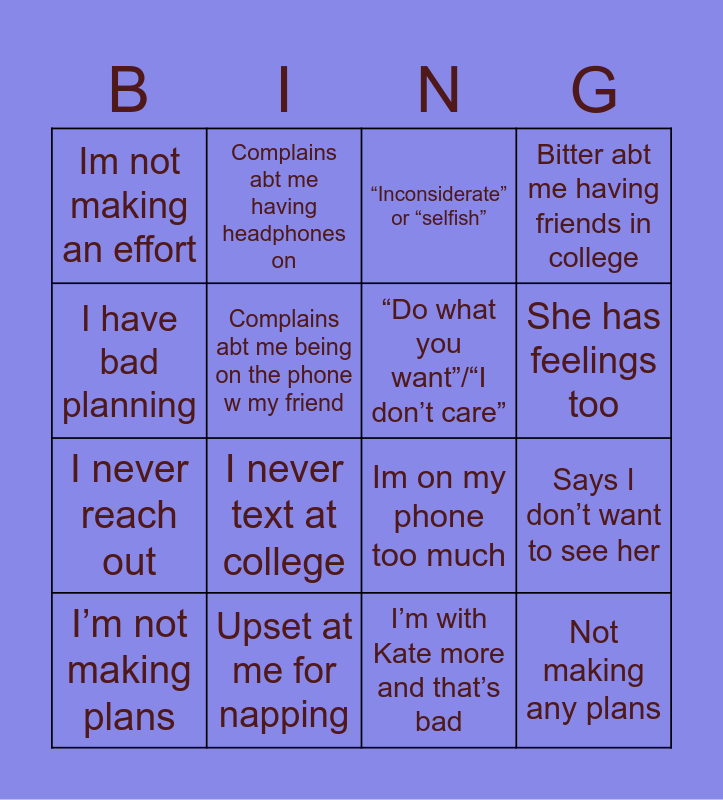 This bingo card has 16 words: Upset at me for napping, Says I don’t want to see her, “Inconsiderate” or “selfish”, Im not making an effort, I never reach out, Complains abt me having headphones on, Im on my phone too much, I’m with Kate more and that’s bad, I have bad planning, Complains abt me being on the phone w my friend, I’m not making plans, Bitter abt me having friends in college, I never text at college, She has feelings too, “Do what you want”/“I don’t care” and Not making any plans.