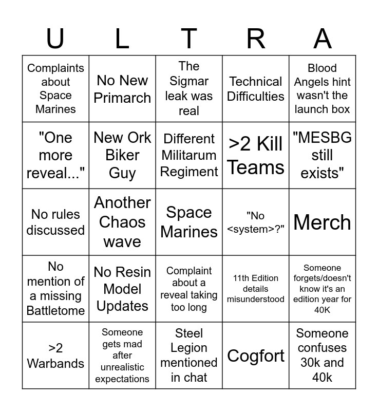 This bingo card has a free space and 24 words: No Resin Model Updates, Someone gets mad after unrealistic expectations, Different Militarum Regiment, >2 Warbands, Blood Angels hint wasn't the launch box, Complaints about Space Marines, "One more reveal...", No New Primarch, "No <system>?", Complaint about a reveal taking too long, >2 Kill Teams, No rules discussed, 11th Edition details misunderstood, Someone forgets/doesn't know it's an edition year for 40K, New Ork Biker Guy, Cogfort, Merch, The Sigmar leak was real, "MESBG still exists", Another Chaos wave, Someone confuses 30k and 40k, No mention of a missing Battletome, Technical Difficulties and Steel Legion mentioned in chat.