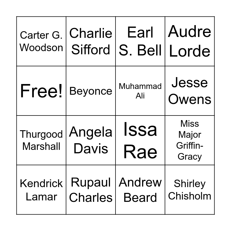 This bingo card has 16 words: Rupaul Charles, Miss Major Griffin-Gracy, Earl S. Bell, Carter G. Woodson, Thurgood Marshall, Charlie Sifford, Issa Rae, Andrew Beard, Free!, Beyonce, Kendrick Lamar, Audre Lorde, Angela Davis, Jesse Owens, Muhammad Ali and Shirley Chisholm.