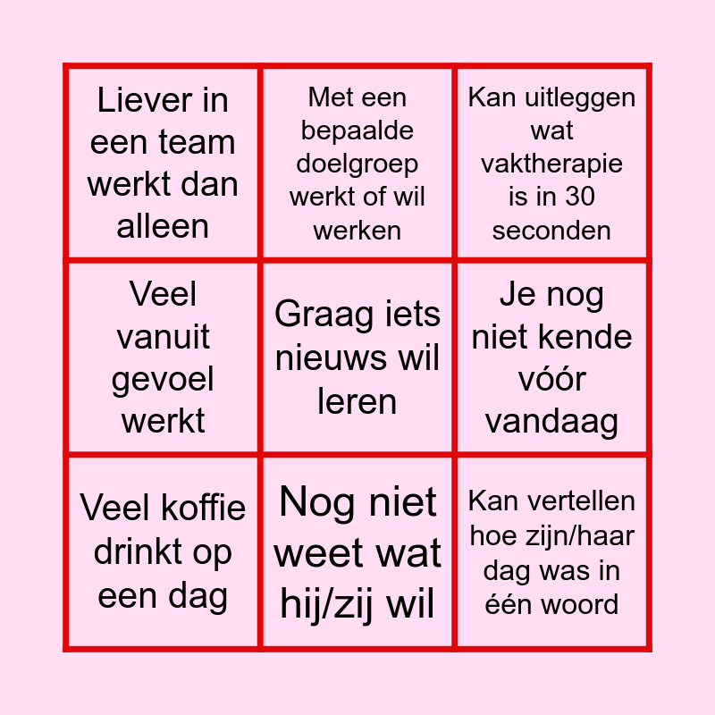 This bingo card has 78 words: Een eigen praktijk zou willen starten, Met een doelgroep werkt die jij interessant vindt, Kan uitleggen wat vaktherapie is in 30 seconden, Een grappige ervaring heeft meegemaakt op stage/werk, Een perfecte pauze kan beschrijven, Kan zeggen hoe zijn/haar dag is in één woord, Zijn/haar stemming in een kleur kan omschrijven, Een slogan voor vaktherapie kan bedenken, Zichzelf kan omschrijven als therapeut, Groepssessies geeft, Liever individuele sessies geeft dan groepssessies, Liever spontaan werkt dan gestructureerd, Veel vanuit gevoel werkt, Liever in een team werkt dan alleen, Van een andere discipline is dan jij, Je nog niet kende vóór vandaag, Nog zoekende is in zijn/haar richting, Een mooie ervaring uit het werkveld kan delen, Zin heeft in het weekend, Liever doet dan praat, Ergens enthousiast over is, Graag iets nieuws wil leren, Een duidelijk toekomstbeeld heeft, Nog niet weet wat hij/zij wil, Veel koffie drinkt op een dag, Graag thee drinkt, Altijd muziek op heeft staan, Altijd te laat gaat slapen, Een ochtendmens is, Graag actief bezig is, Het leuk vindt om wetenschappelijke literatuur te lezen, Graag buiten is, Wat chaotisch is, Een totaal ander beroep zou kiezen als het moest, Kan vertellen wat die leuk vindt aan vaktherapie, Gemotiveerd is om vaktherapeut te worden/zijn, Gelooft in een bepaalde methode of werkvorm, Weet wat zijn/haar kracht is als vaktherapeut, Stage heeft gelopen als vaktherapeut, Zijn/haar ideale baan kan omschrijven, Kan vertellen hoe die aan een baan is gekomen, Kan vertellen wat hij/zij belangrijk vindt in het werk, Een uitdaging ervaart in het werkveld, Iets zou willen veranderen in de praktijk, Kansen ziet voor vaktherapie in de toekomst, Met een bepaalde doelgroep werkt of wil werken, Graag samenwerkt met een andere discipline, Kan vertellen wat vaktherapie uniek maakt, Veel contact heeft met andere vaktherapeuten, Zich zeker voelt in een multidisciplinair team, Bezig is met het profileren van vaktherapie, Weet waar die over 5 jaar wil staan, Een moment nooit zal vergeten uit stage/werk, Verrast werd door het werkveld, Kan uitleggen hoe die balans houdt tussen betrokkenheid en afstand, Liever werkt vanuit theorie dan vanuit gevoel, Graag procesgericht werkt, Graag resultaatgericht werkt, Naast studie/werk ook bezig is in zijn/haar discipline, Een andere discipline zou willen uitproberen, Kan vertellen hoe zijn/haar dag was in één woord, Hier aanwezig is voor de hapjes en drankjes, Kan vertellen hoe die ontspant na een drukke dag, Graag muziek luistert, Kan vertellen waar die blij van wordt, Graag met veel verschillende doelgroepen werkt, Graag met een specifieke doelgroep werkt, Meerdere hobby's heeft, Een hondenliefhebber is, Bang is voor vogels, Een duidelijke visie heeft als vaktherapeut, Kan vertellen hoe zijn school-, stage- of werkdag eruit ziet, Graag met ouderen werkt, Kan vertellen wat hij/zij het leukste vindt/vond aan de opleiding vaktherapie, Nog zou willen doorstuderen, Een misvatting over vaktherapie kan vertellen, Graag met de doelgroep kind en jeugd werkt and Het liefste met volwassenen werkt.