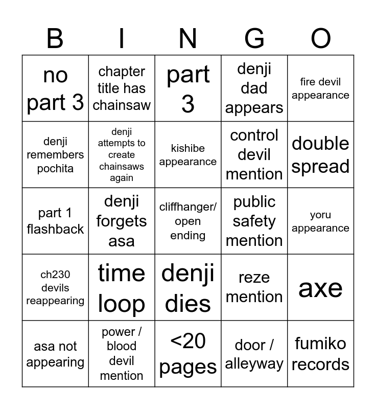This bingo card has a free space and 24 words: time loop, power / blood devil mention, kishibe appearance, asa not appearing, fire devil appearance, no part 3, denji remembers pochita, chapter title has chainsaw, public safety mention, denji dies, control devil mention, part 1 flashback, reze mention, axe, denji attempts to create chainsaws again, door / alleyway, yoru appearance, part 3, double spread, denji forgets asa, fumiko records, ch230 devils reappearing, denji dad appears and <20 pages.
