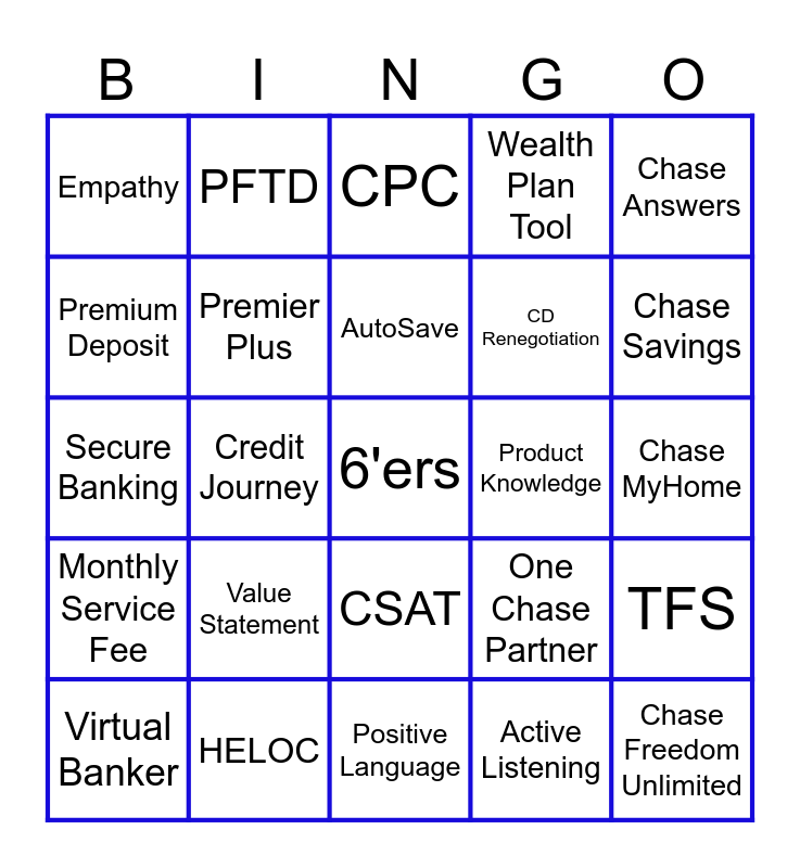 This bingo card has a free space and 24 words: Value Statement, HELOC, AutoSave, Virtual Banker, Chase Answers, Empathy, Premium Deposit, PFTD, Product Knowledge, CSAT, CD Renegotiation, Secure Banking, One Chase Partner, TFS, Premier Plus, Active Listening, Chase MyHome, CPC, Chase Savings, Credit Journey, Chase Freedom Unlimited, Monthly Service Fee, Wealth Plan Tool and Positive Language.