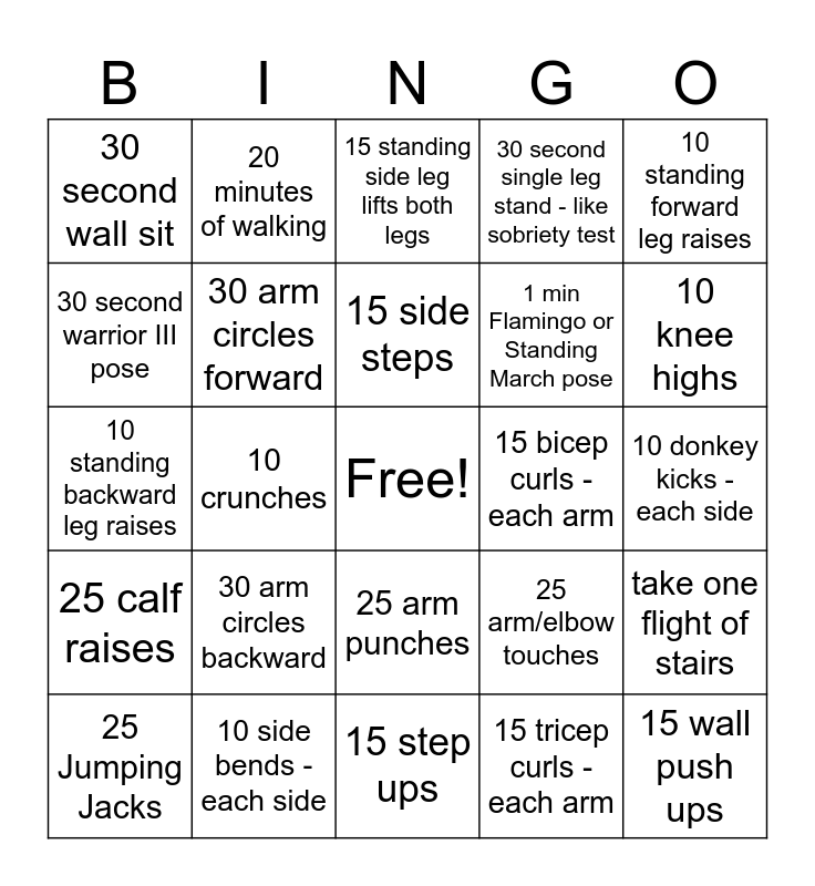 This bingo card has a free space and 29 words: 25 Jumping Jacks, 15 second plank, 10 crunches, 15 squats, 30 second wall sit, 15 standing side leg lifts both legs, 30 arm circles forward, 30 arm circles backward, 15 bicep curls - each arm, 10 side bends - each side, 10 donkey kicks - each side, 15 wall push ups, 15 step ups, 15 tricep curls - each arm, 10 knee highs, 10 tricep dips, 25 arm punches, 25 calf raises, 10 standing forward leg raises, 10 standing backward leg raises, 25 arm/elbow touches, 1 min tree pose, 1 min Flamingo or Standing March pose, 30 second warrior III pose, 30 second single leg stand - like sobriety test, 20 minutes of walking, take one flight of stairs, 15 side steps and 20 step back taps.